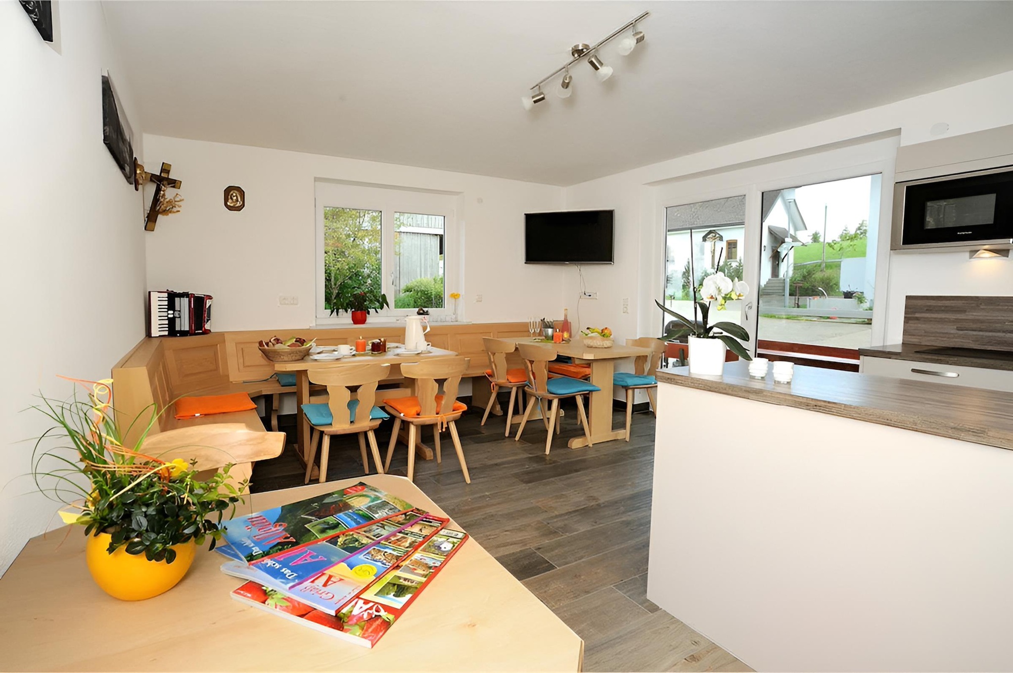 Bitte beachtet: Das Zimmer kann nur ohne Frühstück gebucht werden. Euch steht jedoch ein Aufenthaltsraum mit gut ausgestatteter Einbauküche und großem Esstisch zur Verfügung – ideal, um euch selbst zu verpflegen und alle Mahlzeiten in gemütlicher Atmosphäre zuzubereiten. Vom Aufenthaltsraum aus gelangt ihr direkt auf die Terrasse.