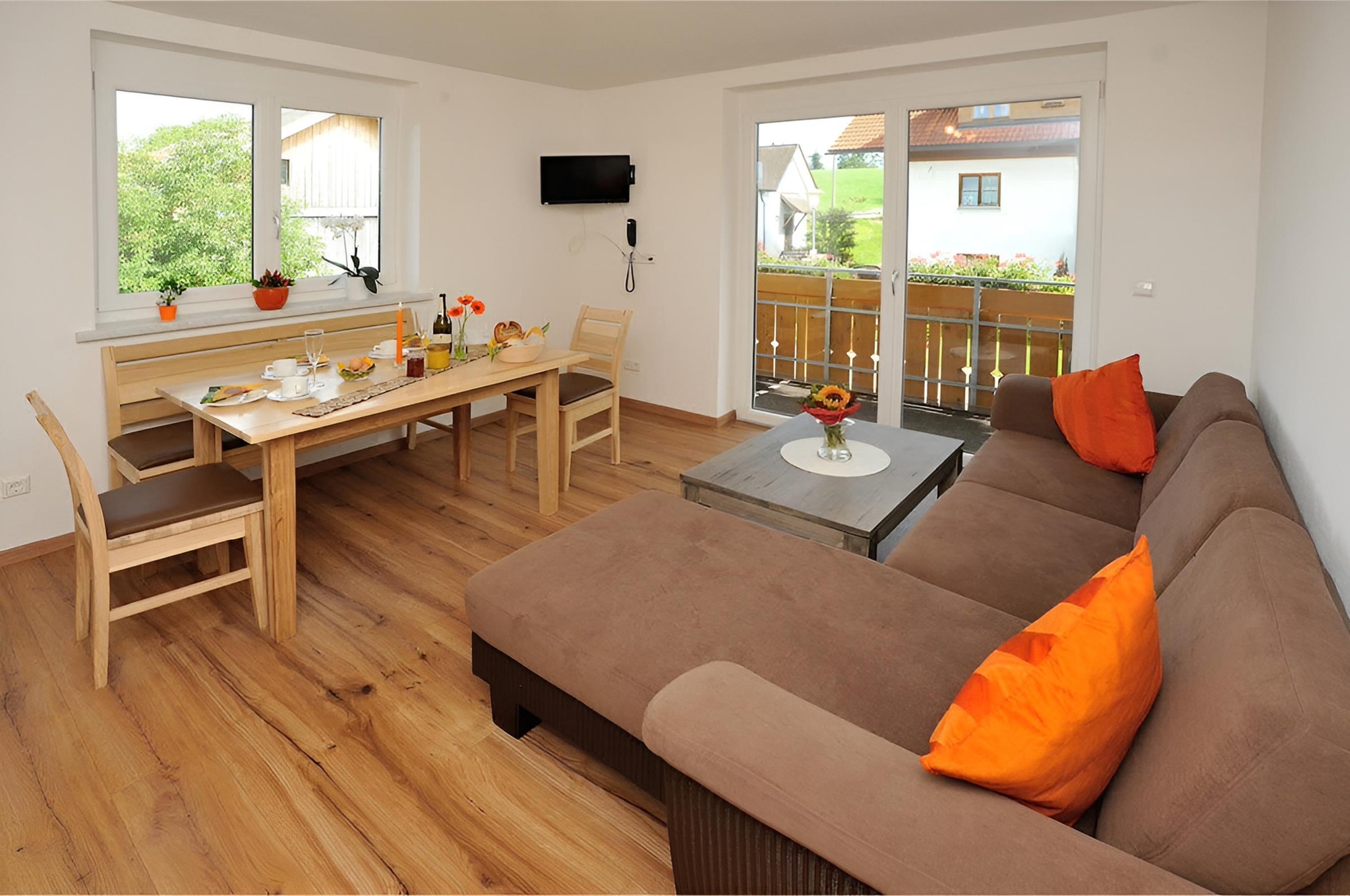Die 65 m² große Ferienwohnung Enzian verfügt über einen großzügigen Südbalkon zur alleinigen Nutzung. Sie bietet zwei Schlafzimmer mit Doppelbetten (je 180 x 200 cm) sowie einen offenen Wohn- und Essbereich mit einer hellen, gemütlichen Wohnküche. Die Einbauküche ist vollständig ausgestattet mit Herd, Backofen, Mikrowelle, Kühlschrank, Gefrierfach, Kaffeemaschine, Wasserkocher, Toaster, Eierkocher, Geschirr, Töpfen, Besteck und Gläsern.